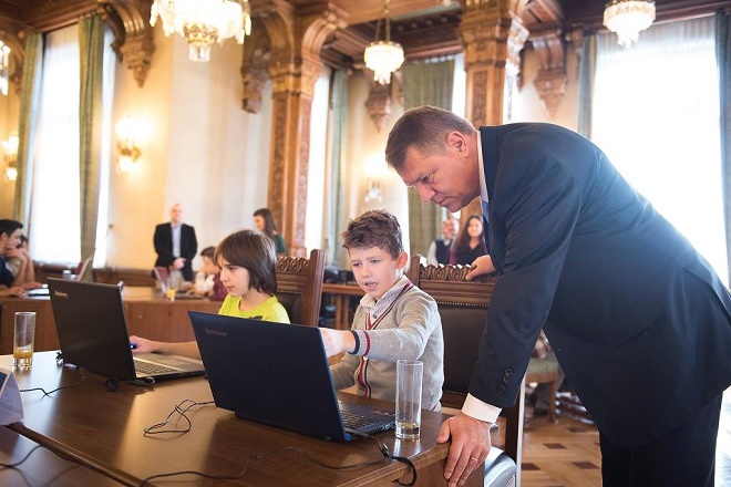 Klaus Iohannis învață programare de la un puști, în campania ”Hour of Code”
