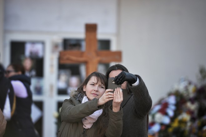 Două tinere îşi fac un selfie în faţa locului unde s-a întâmplat tragedia Foto Mediafax