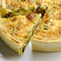 1. Aseaza blatul intr-o tava rotunda, unsa cu unt, si inteapa-l din loc in loc cu o furculita. Aseaza peste buchetelele de broccoli, pe care le-ai oparit cateva minute in apa clocotita cu sare, dupa ce s-au scurs bine.
