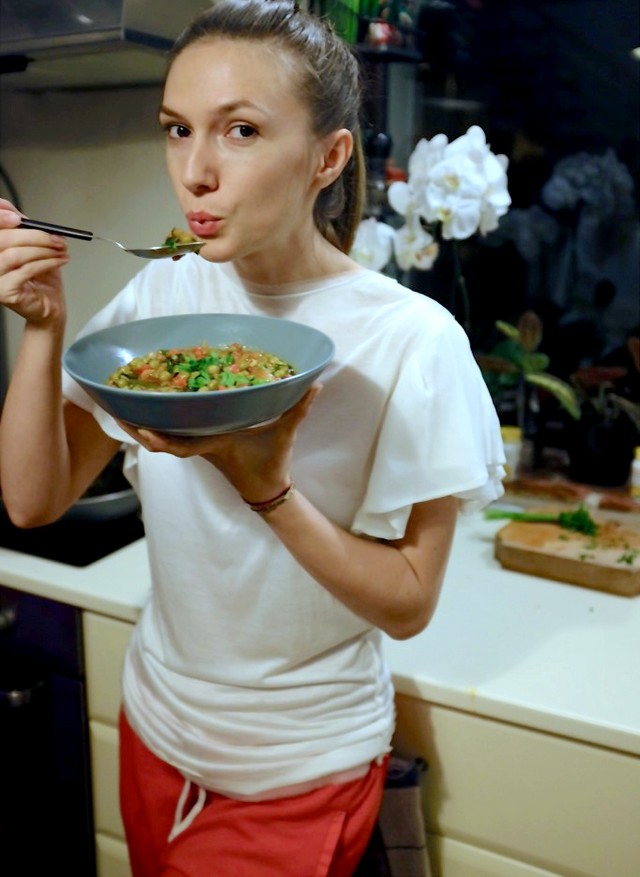 Adela Popescu gustând din mâncărica de mazăre pe care i-a făcut-o iubitului său, Radu Vâlcan