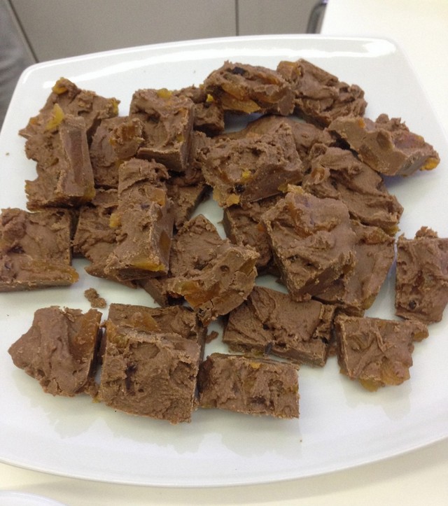 Laptele praf se amestecă cu cacaua, cuişoarele, vanilia şi cubuleţele de caise. Punem apa la fiert cu zahărul. Amestecăm până se dizolvă. Dacă vreţi ciocolata mai moale faceţi un sirop subţirel. Când siropul e gata, stingem focul şi adăugăm laptele praf împreună cu tot amestecul, în câteva tranşe, până se omogenizează bine. Adăugăm untul şi amestecăm. Se pune la frigider în forme de inimioare, floricele sau ce mai găsiţi prin casă.