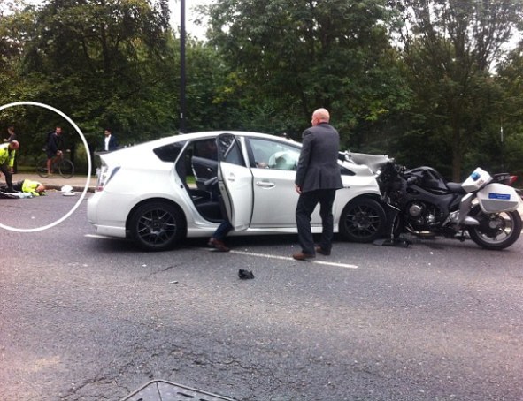 Potrivit unui biciclist, care a dorit să rămână anonim, convoiul prinţului Harry, alcătuit din două automobile Range Rover şi patru poliţişti motociclişti, circula "cu o viteză incredibil de mare".