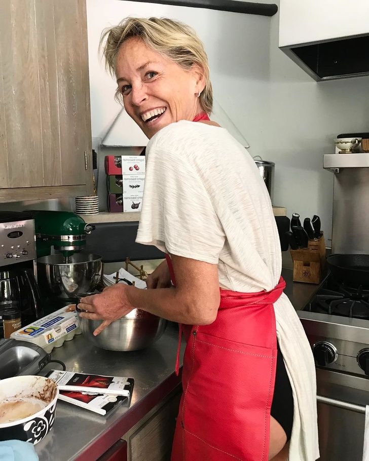 Sharon Stone, pregătind o prăjitură, într-o duminică