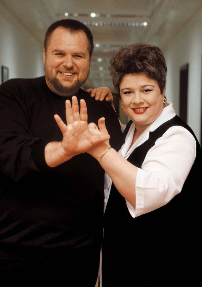 Teo, pe vremea când era supraponderală, alături de un alt ”gras”, realizatorul Cristian Tabără