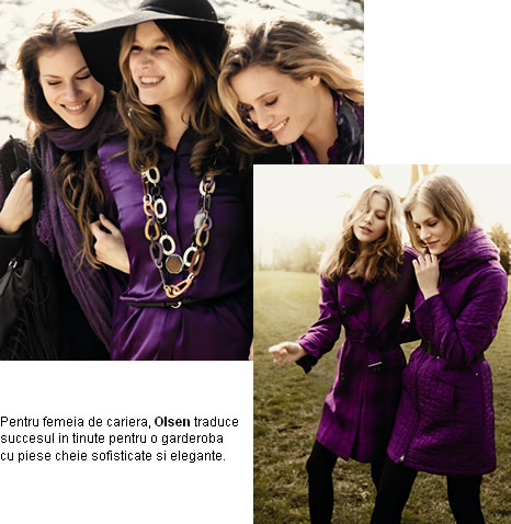 Cusaturile fine si detaliile elegante dau un nou sens al valorilor care se concetreaza in liniile Olsen. Culorile neutre si calde creaza un look natural, sensibil si foarte feminin in care accentele de purpuriu si turcoaz creaza efecte vizuale seducatoare.