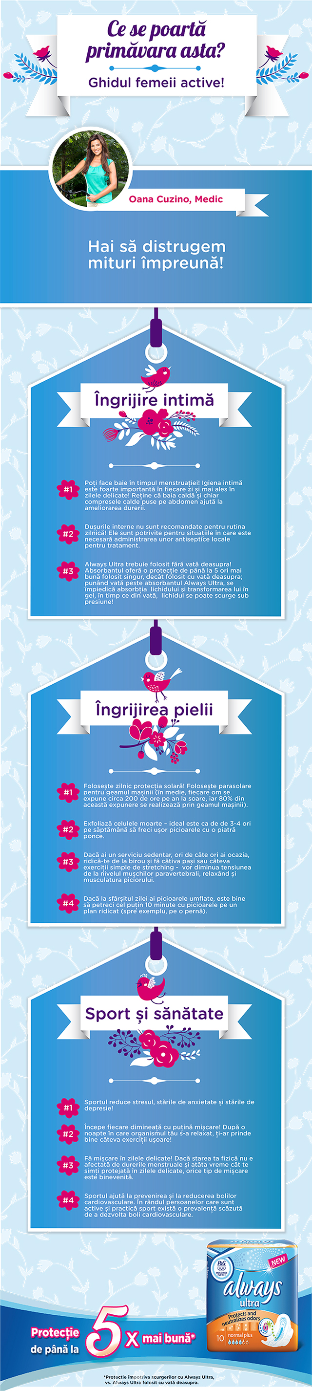 Oana Cuzino: „E important să te poți pune în valoare, deci trebuie să fii informată corect și complet cu privire la sănătatea și frumusețea ta. Alături de Always, am creat acest ghid al femeii active în care vei găsi îndrumări scrise cu prietenie, cu înțelegere și cu respect față de feminitatea ta. Și pentru că ești o femeie activă și modernă, Always te susține, oferindu-ți siguranță și confort, pentru ca tu să te poți bucura de toate provocările zilnice.″