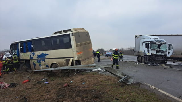 UPDATE Accident teribil în județul Timiș: ciocnire frontală între un autobuz și un TIR. 18 persoane se aflau în cele două vehicule FOTO