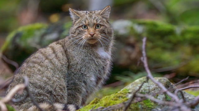 Exemplar superb de pisică sălbatică, surprins într-o pădure din Parcul Național Retezat FOTO