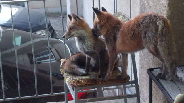 Imagine inedită cu două vulpi într-un moment de „tandrețe”, surprinsă pe terasa unei instituții din Cetatea Alba Iulia