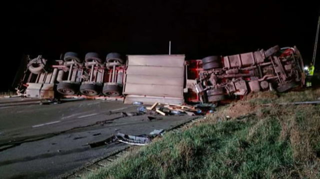 TIR plin cu OSB, răsturnat pe E85, la Suceava. Traficul rutier este complet blocat