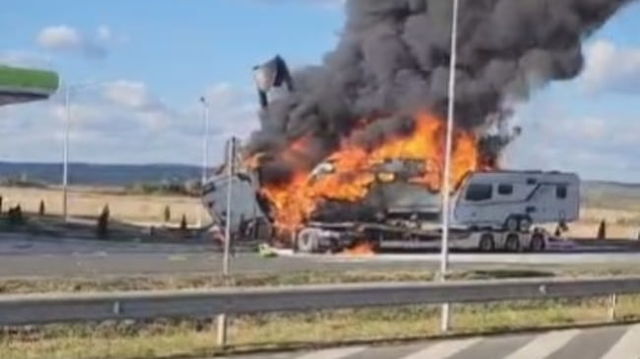 Pericol de incendiu la o benzinărie de pe A1. Un TIR a luat foc după ce a lovit panoul publicitar VIDEO/FOTO
