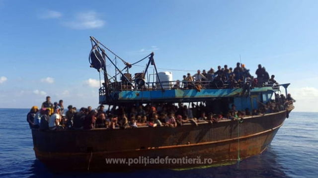 Un număr de 400 de migranți înghesuiți pe o barcă de pescuit, salvați de polițiștii români de frontieră. Misiunea, în timpul unui exercițiu pe Marea Mediterană FOTO