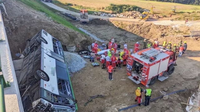 Accident teribil în Austria. Un autobuz școlar a căzut de pe un pod, de la patru metri înălțime.