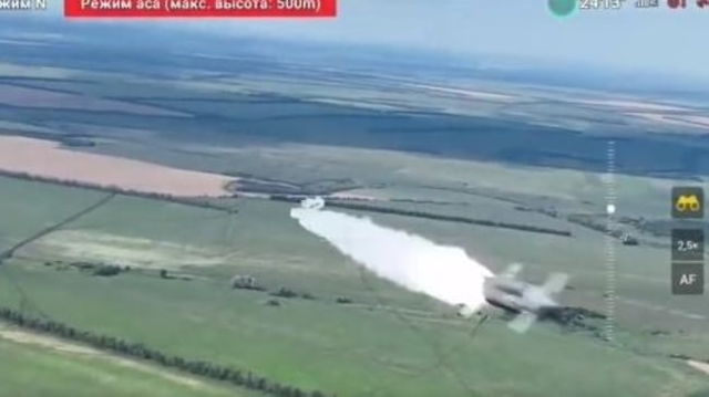 Momentul în care o rachetă rusească trece pe lângă o dronă ucraineană. Rușii au ratat ținta VIDEO