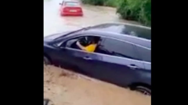 Momente de panică în Arad, după ce o mașină a fost surprinsă de ape pe un drum judeţean. „Copilul, doamnă, copilul. Deschideți geamul” VIDEO