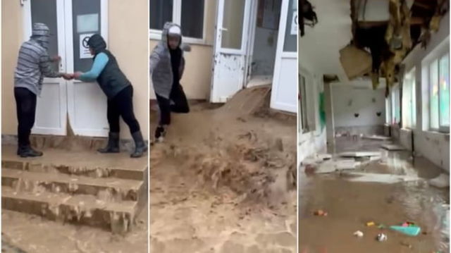 Furia unei viituri, într-un sat din Ardeal. Apa a intrat într-o grădiniță prin tavan. Momentul când este deschisă ușa VIDEO