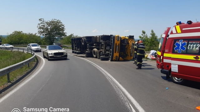 TIR răsturnat pe şoseaua din Timiş care preia tot traficul de pe autostradă FOTO