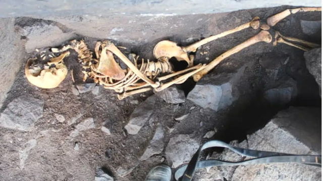 Scheletele a șase tineri bărbați descoperite într-o peșteră. Au fost găsite cu faţa în jos, cu mâinile legate şi acoperite de pietre