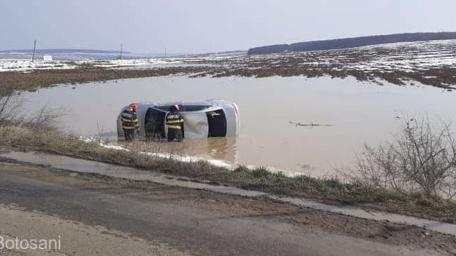 O mașină s-a răsturnat într-o baltă uriașă formată după topirea zăpezii. Accidentul bizar s-a produs în Botoșani