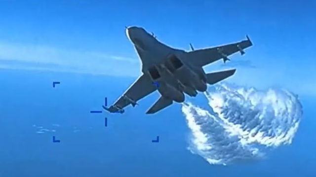 Filmarea incidentului ruso-american din Marea Neagră. Înregistrarea arată cum pilotul Suhoiului aruncă combustibil peste dronă VIDEO