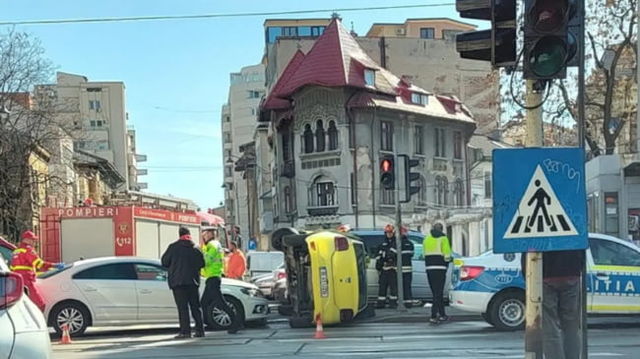Taxi răsturnat pe linia de tramvai în centrul Bucureștiului. Clientul este rănit, iar circulația a fost blocată