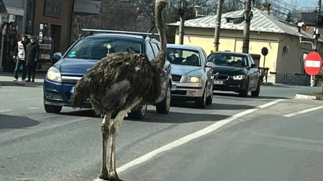 Imagini virale cu un struț care s-a plimbat printre mașini, în Găești. De unde a apărut pasărea exotică FOTO