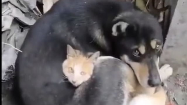 Imagini emoționante cu un câine și o pisică care își țin de cald, printre ruinele din Turcia VIDEO