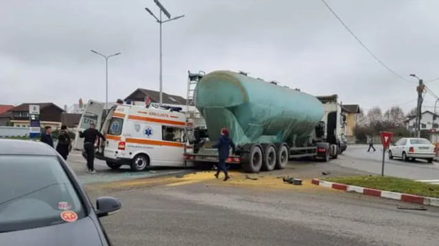 Ambulanță zdrobită într-un accident. Asistenta și șoferul, răniți grav, pacientul este în comă