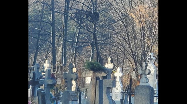 Urs cățărat în copac printre mormintele din cimitir. Imaginile suprinse de localnici FOTO