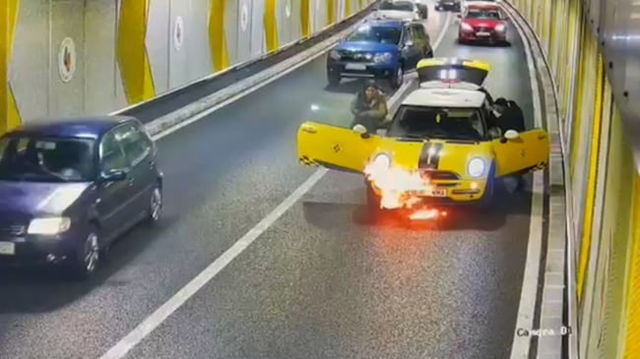 Momentul dramatic în care o mașină ia foc în pasajul Unirii. Nimeni nu a sărit în ajutorul pasagerilor care aveau și un bebeluș în brațe VIDEO