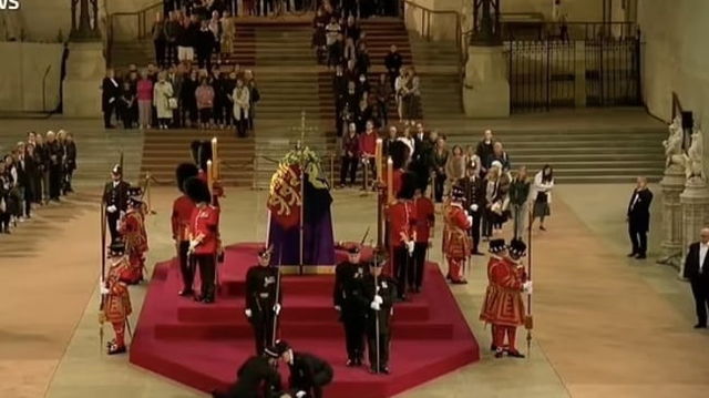 Momentul în care un membru al gărzii regale leșină lângă catafalcul Reginei Elisabeta a II-a, după 6 ore de priveghi VIDEO