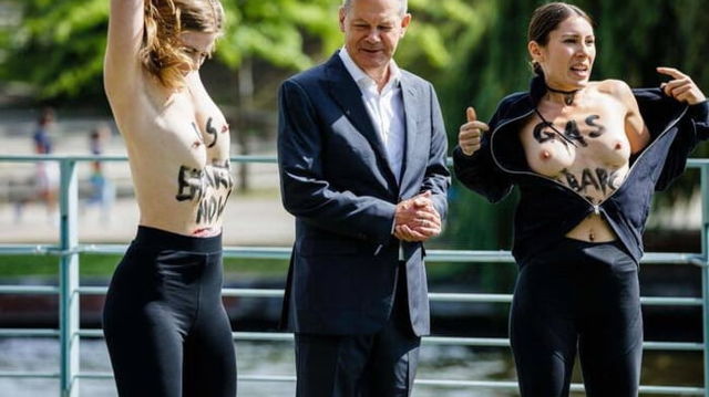 Cancelarul german, ”plăcut surprins” de două militante în sânii goi. Ce i-au cerut protestatarele