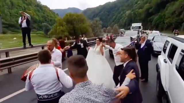 Un alai de nuntă blocat în trafic nu a mai avut răbdare să ajungă la restaurant și a încins o sârbă pe Valea Oltului VIDEO