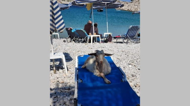 Capră relaxată în șezlong pe o plajă din Grecia. "Dacă n-ați pus prosopul de la 6.00 dimineața..."