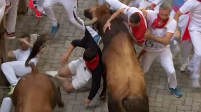 Momentul dramatic când mai mulți tineri sunt călcați de tauri și răniți cu coarnele în timpul festivalului San Fermin, din Spania VIDEO