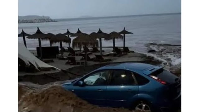 Mașini îngropate în nisip pe o plajă din Thassos. O furtună a făcut prăpăd în sudul insulei