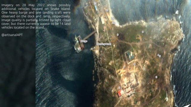 Imagini din satelit de pe Insula Șerpilor care arată mișcările trupelor ruse din ultimele două săptămâni