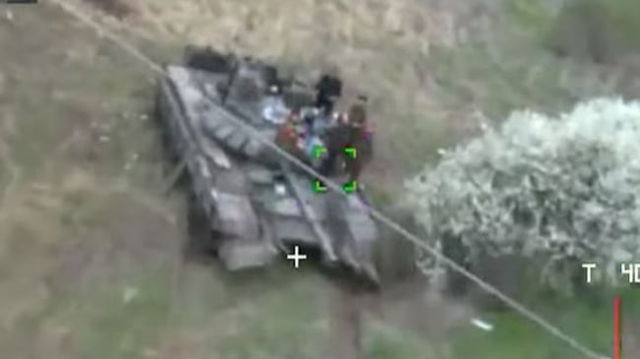 Cum a distrus o dronă Switchblade un tanc pe care stăteau cocoțați mai mulți soldați ruși ce beau alcool VIDEO