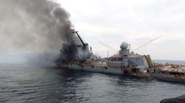 Ultima imagine a crucișătorului Moskva înainte de scufundare. Fumul gros se înălța din zona motorului FOTO