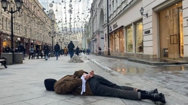 Protest tulburător la Moscova: bărbat căzut pe stradă cu mâinile legate, precum victimele măcelului din Bucea FOTO