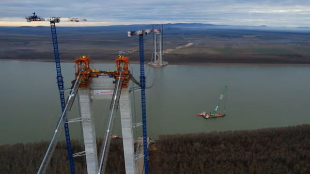Imagini spectaculoase cu podul suspendat peste Dunăre. Golden Gate de România va fi gata anul acesta VIDEO