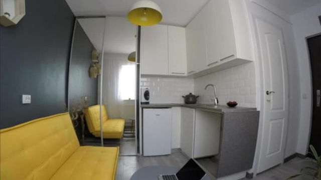 Bizarerie imobiliară la Cluj: garsonieră de închiriat cu suprafața cât o bucătărie obișnuită. ”Dacă adorm pe canapea, îmi sare uleiul de la cartofii prajiți pe față”