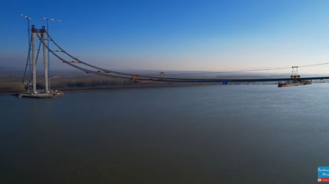 Noi imagini spectaculoase cu podul suspendat peste Dunăre. Cum arată malul din Tulcea și legătura cu Măcin VIDEO
