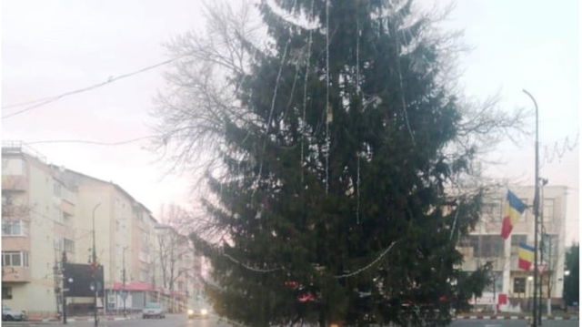 Un brad uriaș a fost montat de autorități chiar în mijlocul șoselei din orașul Panciu VIDEO