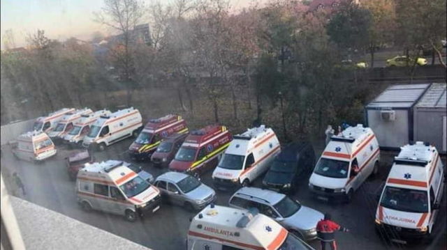 Imaginea dezastrului la Buzău. Curtea Spitalului Județean este blocată de ambulanțe cu pacienți COVID care nu mai au loc în unitate