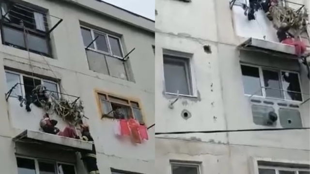 Salvare la limită a unui bărbat căzut de la etajul 4, rămas agățat pe copertina unui apartament VIDEO