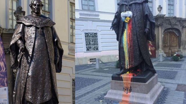 Statuia lui Brukenthal din Sibiu a fost vandalizată. Bărbat căutat de polițiști după ce a aruncat cu vopsea în culorile tricolorului