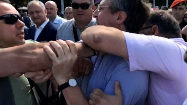 Momentul in care fostul primar al Chisinaului Dorin Chirtoaca se nepusteste asupra lui Igor Dodon. A fost culcat la pamant VIDEO