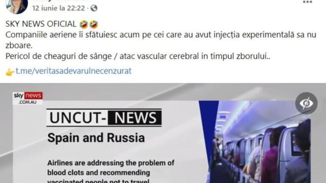Fake-news diseminat profesionist in Romania: companiile aeriene le dezvaluie vaccinatilor ca fac tromboza in avion. Minciuna a atins zeci de mii de oameni