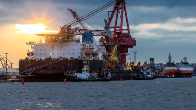 Nava ruseasca care monteaza conducte in apele teritoriale ale Germaniei. Lucrarile la gazoductul Nord Stream 2 au fost reluate